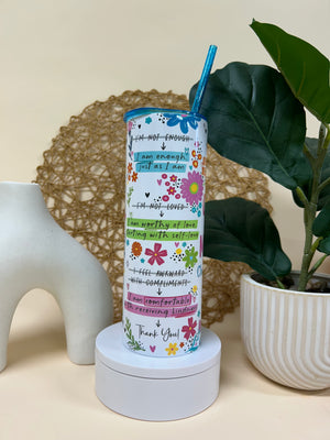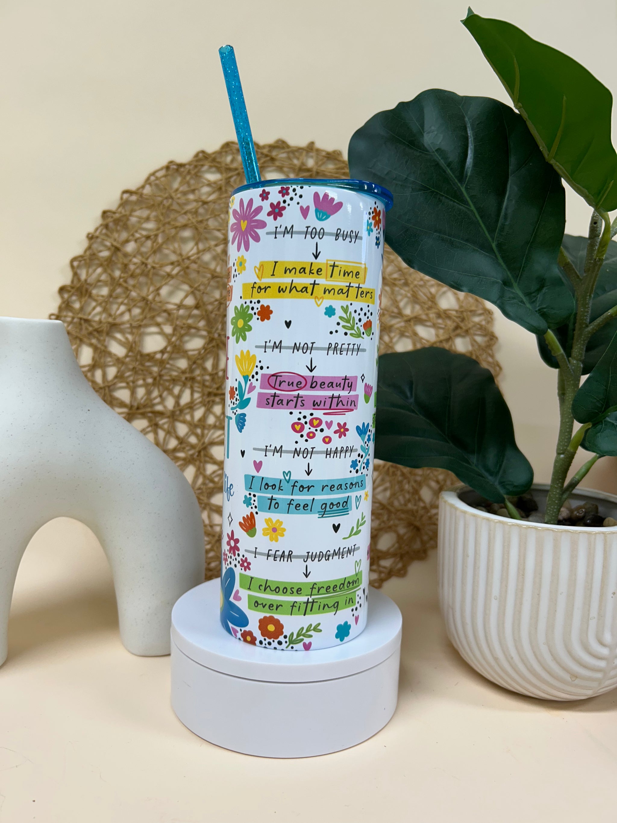 "Transform your mindset with these inspiring quotes that will remind you of your true worth." This tumbler is one of my favorites so far, it makes me feel confident and inspired. The quotes and colors are just perfect.