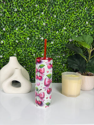 Skinny tumbler holds 20 oz of hot or cold drinks.