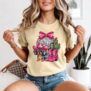 Experience comfort and style with the Cowgirl Dachshund Tee, crafted from heavyweight garment-dyed, ring-spun 100% cotton for a soft yet durable feel. Choose between two vibrant colors to suit your wardrobe, providing a perfect blend of casual charm and lasting quality. This tee delivers both comfort and standout style for everyday wear.