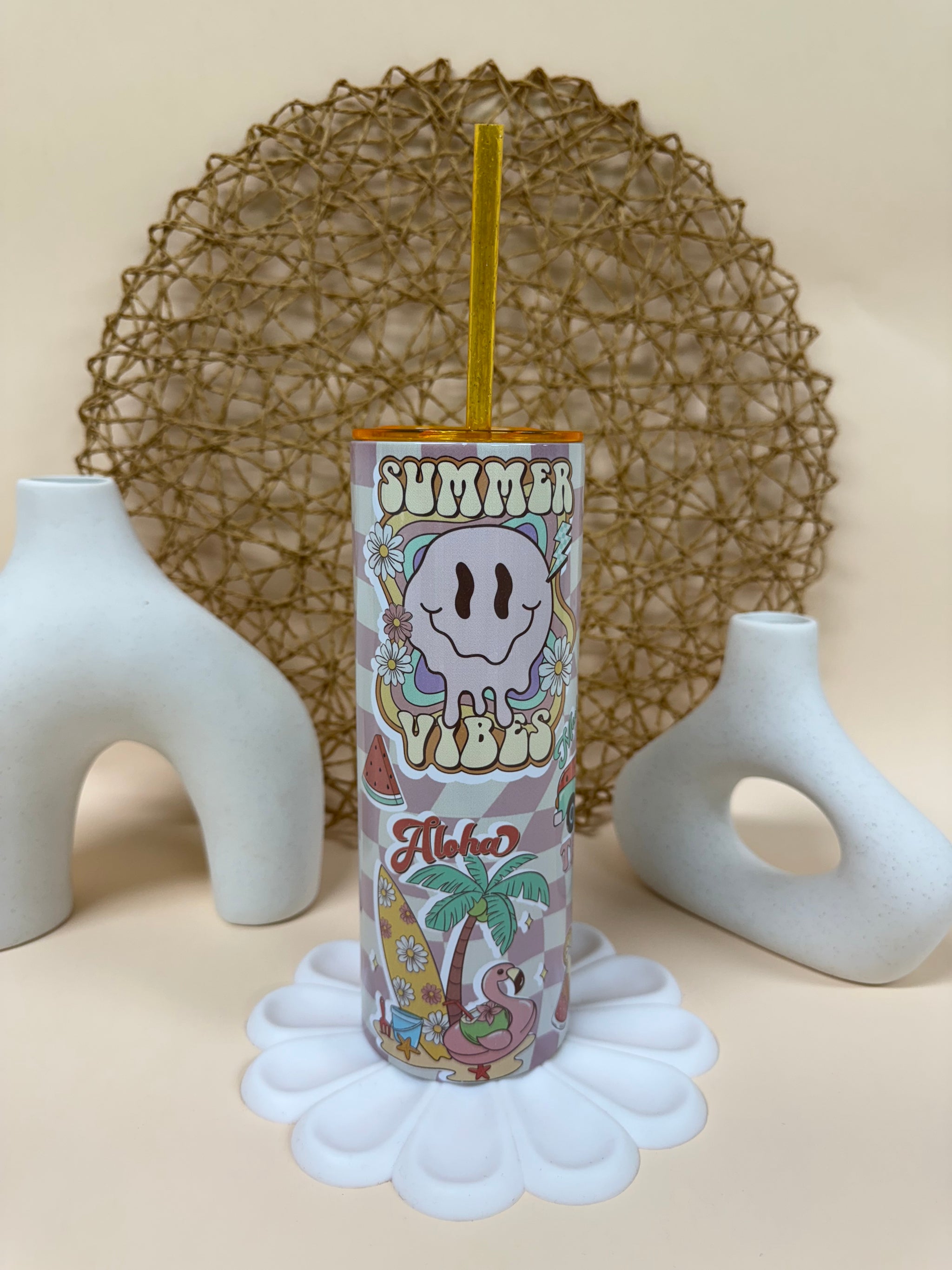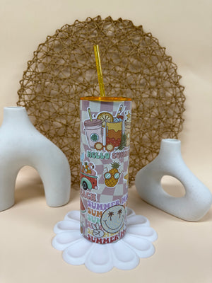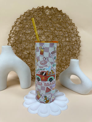 Skinny tumbler holds 20 oz of hot or cold drinks.