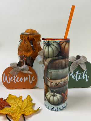 Skinny tumbler holds 20 oz of hot or cold drinks.