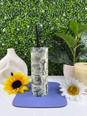 Skinny tumbler holds 20 oz of hot or cold drinks.