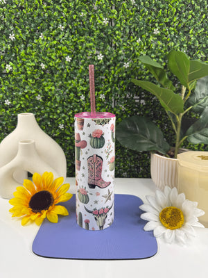 Skinny tumbler holds 20 oz of hot or cold drinks.